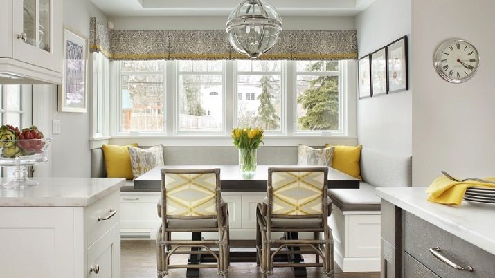 Un racó assolellat de la cuina us animarà fins i tot en un dia ennuvolat. Afegiu detalls de color blau clar o delicats de color gris clar al groc i la zona del menjador brillarà amb un nou llum. Un sofà negre amb coixins grocs brillants sembla molt interessant.