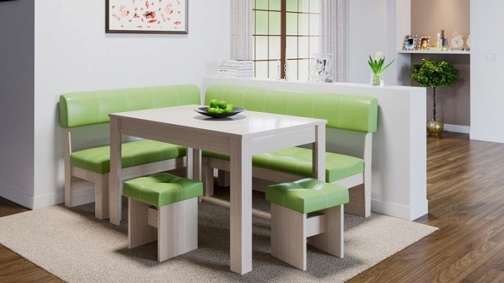 Un esquema de colors amb èxit per a la cantonada de la cuina és una combinació de verd clar amb tons grisos o marrons clars. El color verd fosc del sofà a l’esquena, combinat amb un seient verd calç, es convertirà en un punt brillant a la cuina, de colors verds.
