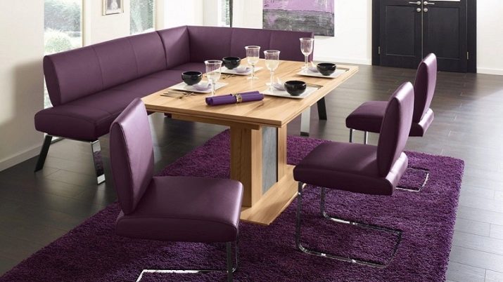 Una solució inusual per a la zona de menjador pot ser els colors morats de diversos tons. Violet harmonitza bé amb materials com el vidre i el metall, de manera que es pot utilitzar per a un racó de cuina en alta tecnologia o estil modern.