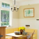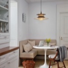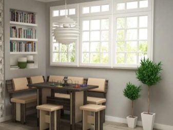 Si queda espai entre els auriculars i la paret amb la finestra, és aquesta part de l’habitació que podeu portar a la cantonada. En aquest lloc val la pena col·locar un conjunt de mobles amb un banc lacònic de tipus G o U, equipat amb calaixos interiors. És millor que la seva taula tingui un suport fiable i estable que quatre potes. En aquest cas, es pot perforar un costat de la taula, la qual cosa és bo per evitar ferits quan es mogui en una petita cuina.