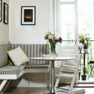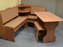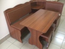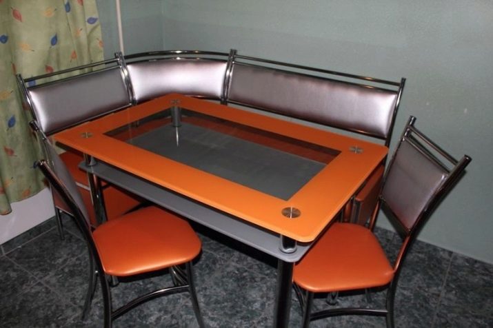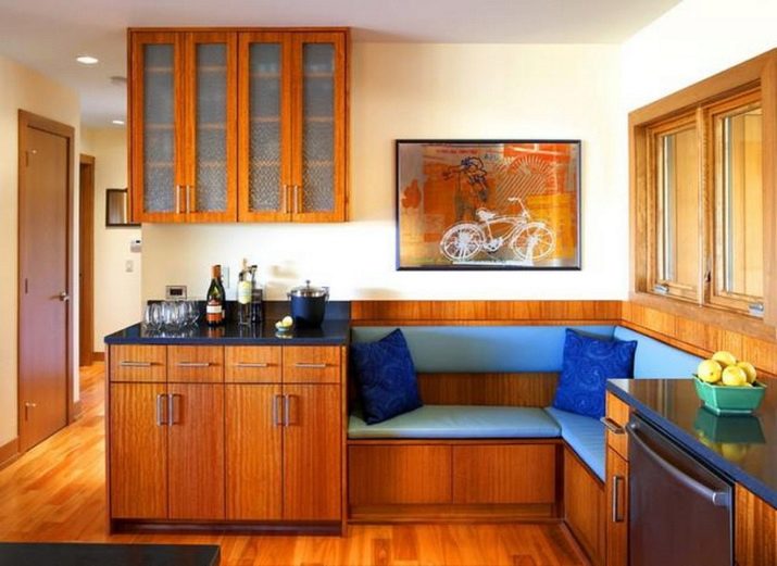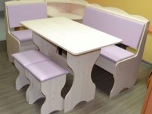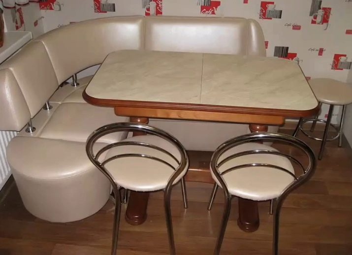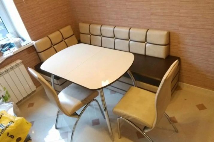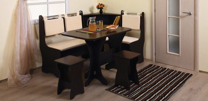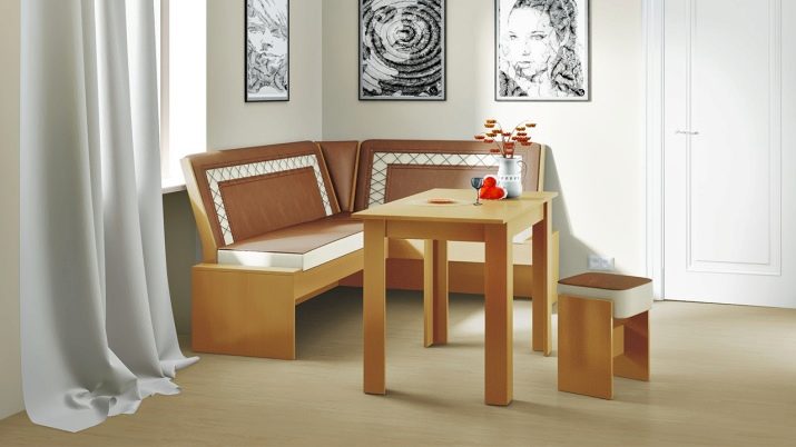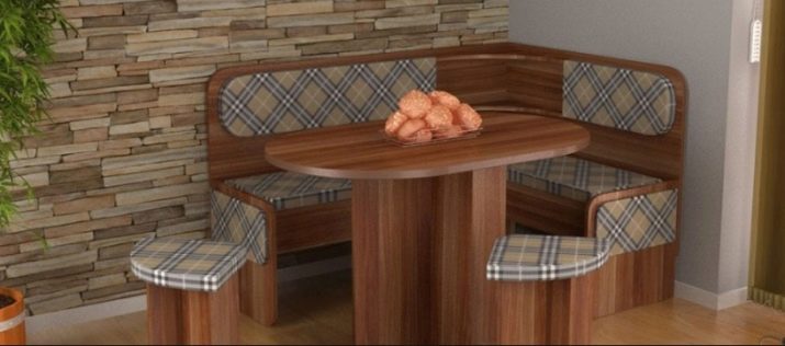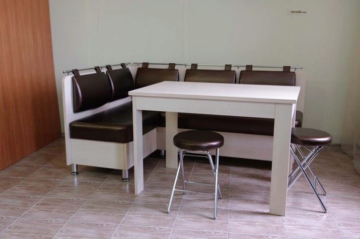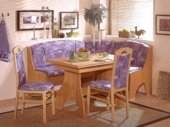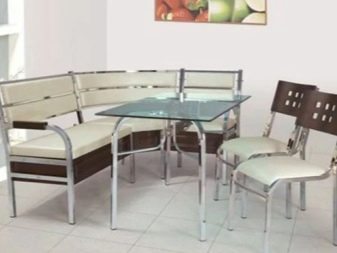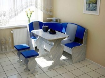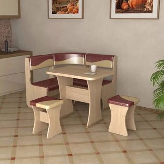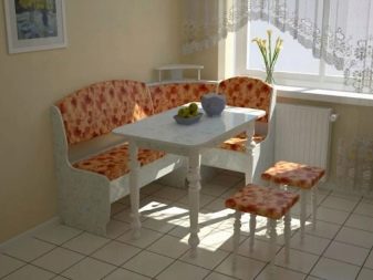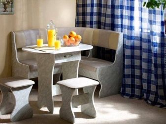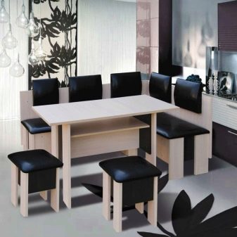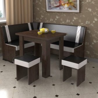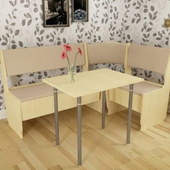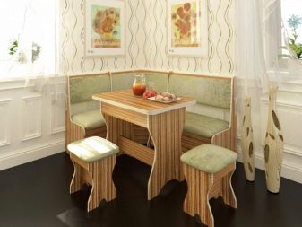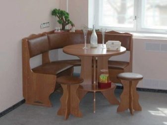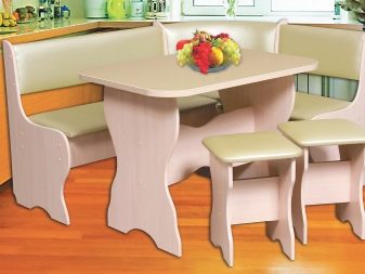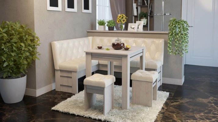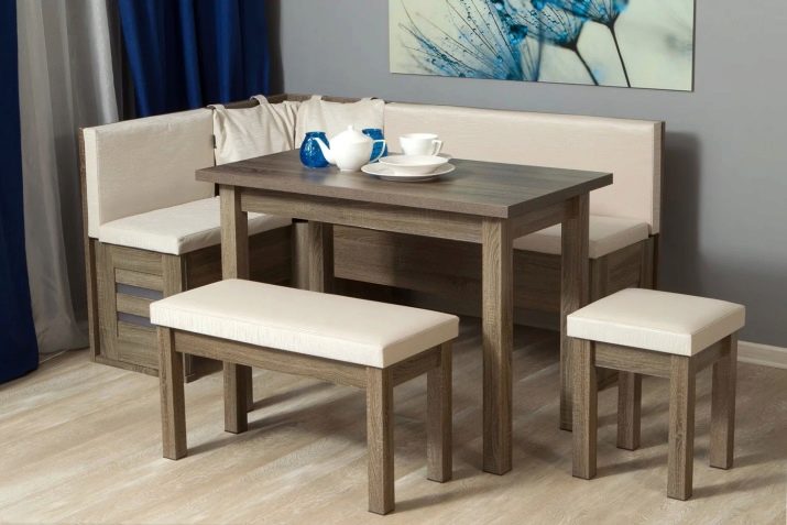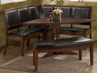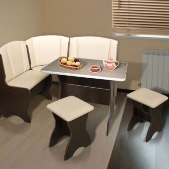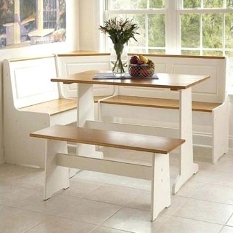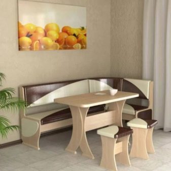 Aquests mobles ofereixen una taula per menjar i un banc de cuina. La seva configuració pot ser molt diversa. Per exemple, pot ser un model amb la forma d’un banc ordinari, una opció amb l’esquena. Al mateix temps, els models de cantonada poden ser tant clàssics rectes (lineals) com angulars. Sovint un banc amb taula es complementa amb tamborets compactes, de vegades la seva forma s’assembla més a un sofà compacte i estretel model del qual pot ser tant recte com angular.