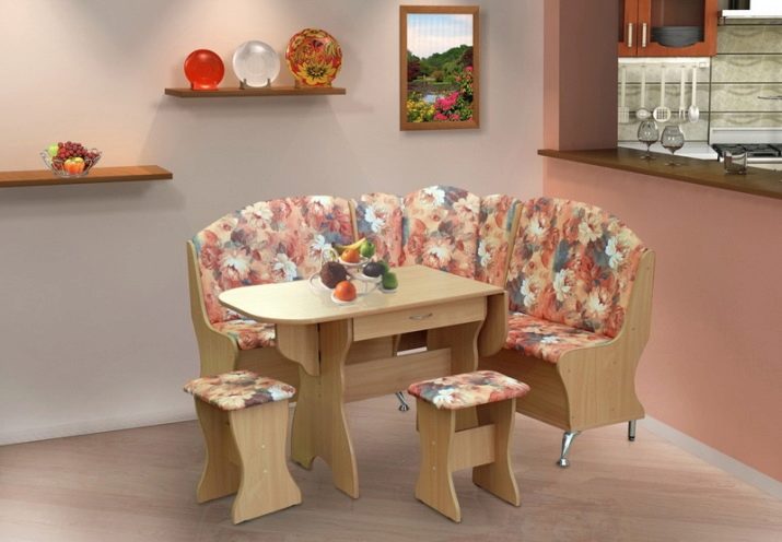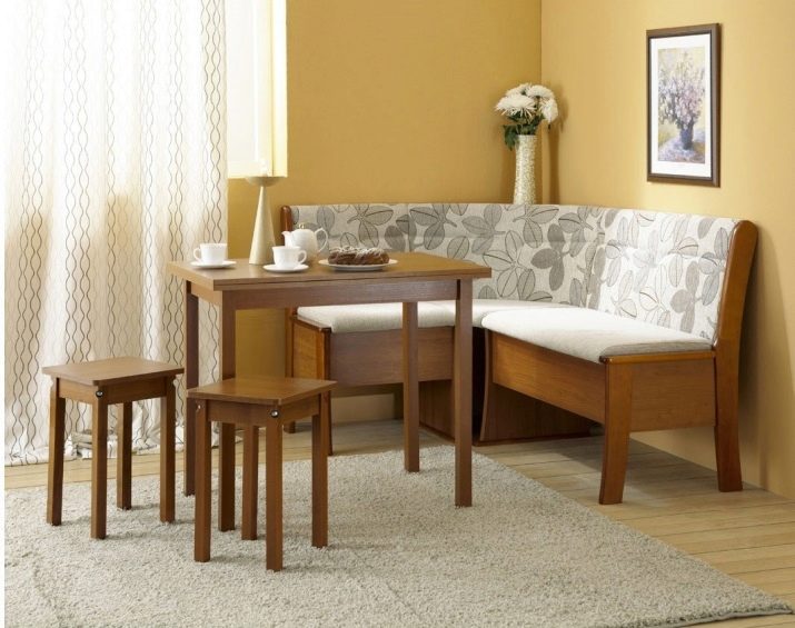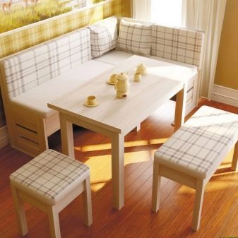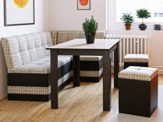 Aquests conjunts no són més que una taula, un parell de tamboret i un banc de cuina, sota el seient dels quals hi ha 1 o 2 calaixos relativament capaços. La seva mida és suficient per allotjar estris de cuina que no s’utilitzen sovint. A més, les mestresses de casa solen utilitzar aquests calaixos per emmagatzemar altres coses per tal de reduir visualment la quantitat de coses petites que solen omplir una cuina petita. Per regla general, per accedir a la caixa, n'hi ha prou amb plegar el seient.