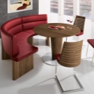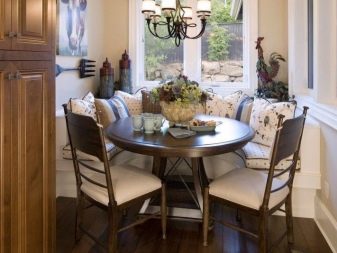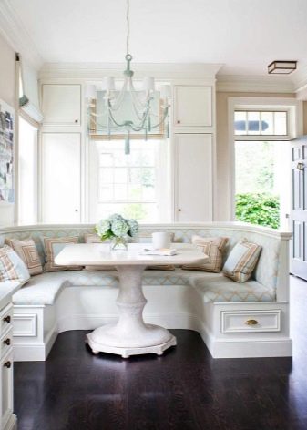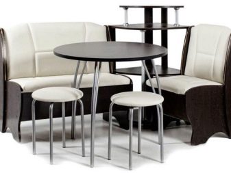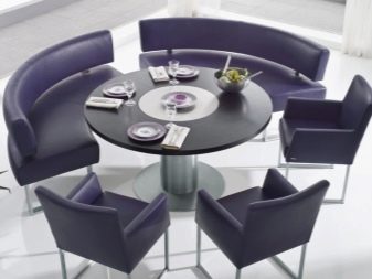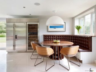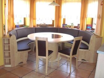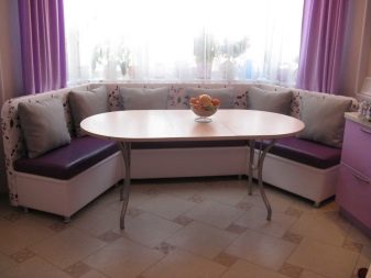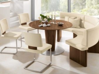La taula rodona proporciona un petit racó. Per tant, molta gent no hi pot entrar. Si sou el propietari d’una cuina gran, podeu optar per aquests models. A causa de l'absència de racons, aquest producte és especialment pràctic si hi ha nens petits a la casa. Tingueu en compte que seure a les vores del sofà serà molt incòmode.
