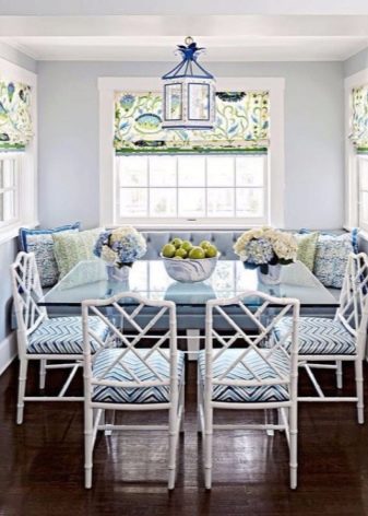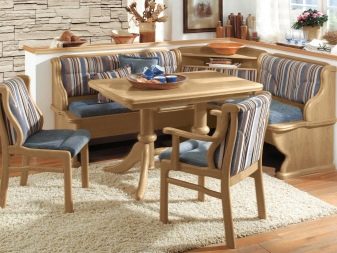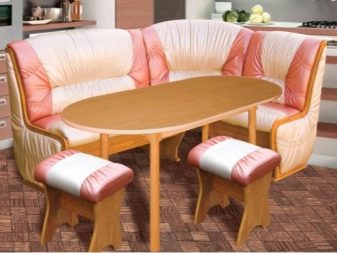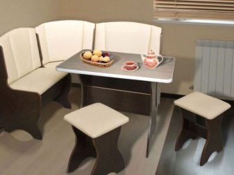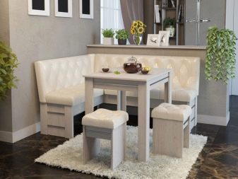 - Els mobles creen un ambient acollidor. Molts components, com els sofàs o els otomans, solen estar folrats de material. Gràcies a aquesta tècnica, la cuina es veu més càlida i còmoda. Si escolliu el color adequat, la cantonada s'adaptarà a qualsevol disseny de l'habitació.