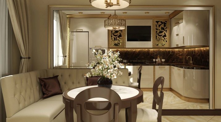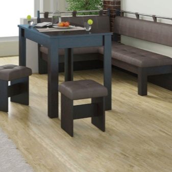 - Tingueu en compte que el seient i la taula han de tenir el mateix disseny. Per una comoditat, la cantonada de la cuina no ha d’ocupar més d’1 / 2 de l’habitació.