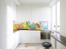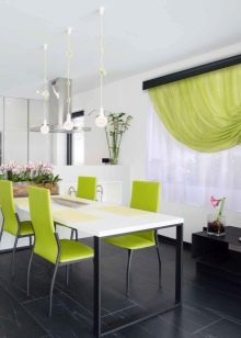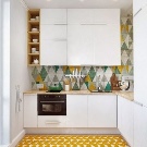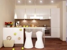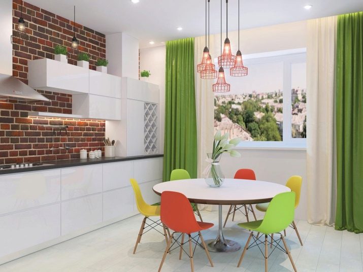 Hi hauria d’haver pocs accents de color en una habitació petita. Per exemple, podeu ressaltar la zona de menjador amb cadires lluminoses. Podeu centrar-vos en l’àrea de cuina escollint un davantal de colors. Podeu dissenyar una finestra amb una cortina de colors, repetint l’ombra en un altre tèxtil.