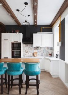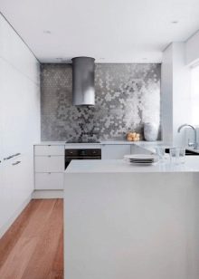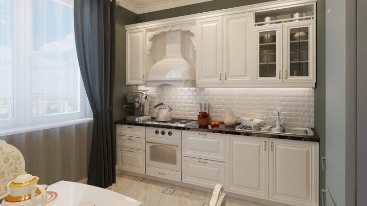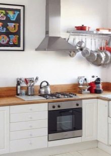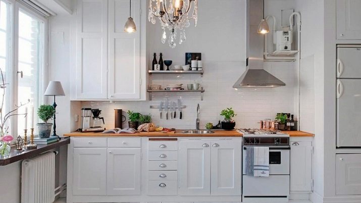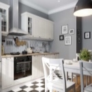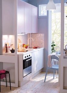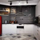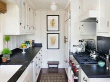 El terra es pot decorar amb rajoles o parquets en blanc i negre. Per a parets, el guix de colors suaus és perfecte. És millor fer un davantal discret.