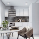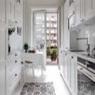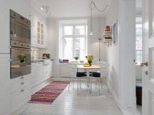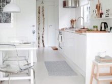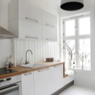 L’interior escandinau és harmoniós i elegant. Aquí, l’abundància de blanc es complementa amb matisos llenyosos naturals, verds vibrants en olles. Els auriculars han de ser el més simples possibles. Els armaris superiors sovint són substituïts per prestatges oberts.