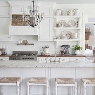 La cuina d'estil provençal té un estil rústic. El blanc es combina amb tons blaus, olives, menta, beix, gris, marrons. Estampats florals adequats, gàbia. Les façanes pintades de fusta es combinen amb la textura natural de fusta, pica de ceràmica, teixits brillants.