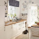 Pot haver-hi rajoles o parquets a terra. A les finestres hi ha unes cortines de colors clars. Les parets es poden pintar amb to suau o paper pintat. Per a un davantal, solen triar rajoles "senglars" o ceràmiques de forma quadrada.