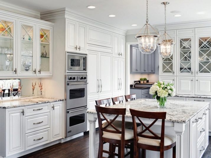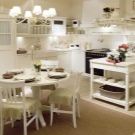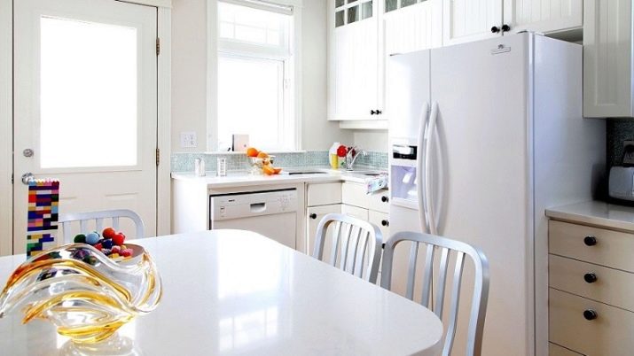 - La facilitat de combinació. La blancor va bé amb els colors pastel, i amb tons foscos contrastats i amb colors vius. Al mateix temps, podeu canviar fàcilment l'estat d'ànim de l'interior afegint-hi altres tons.Els nous tèxtils, accessoris, cadires poden fer que la cuina sigui més brillant o frenada, introdueixi calor a l’ambient o, per contra, frescor freda.