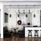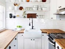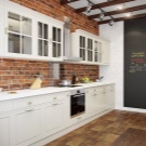 Una senzilla suite blanca contra un mur de maó o formigó: un bon concepte per a una petita cuina. Làmpades metàl·liques, prestatgeries de fusta groseres, accessoris cromats, sistemes de barana completaran l’interior industrial.