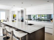 El davantal per a un audiòfon blanc de neu ha d’estar fabricat amb un material resistent a la humitat. Normalment és de rajola ceràmica, plàstic o vidre. Pintar pot ser qualsevol. No feu només el davantal blanc si el color dels taulells i els armaris és el mateix. En cas contrari, fins i tot els auriculars més bonics perdran la seva claredat i expressió.