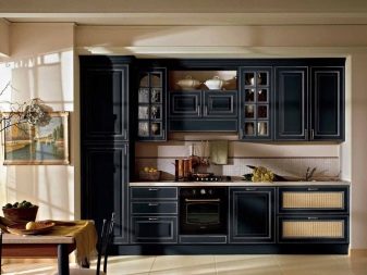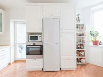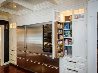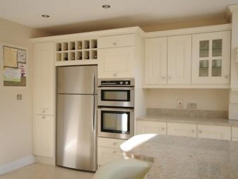 En alguns casos, un parell de compartiments superiors romanen desocupats en els estoigs. S'hi col·loquen diverses decoracions i es destina un altre espai a una nevera. Així que "s'amaga" dels ulls indiscretos, sense violar l'estilística de l'interior. Per treure una mica d’espai lliure, les fundes de llapis s’ajusten de manera eficaç i harmònica a l’ambient de la cuina, fet de qualsevol manera.