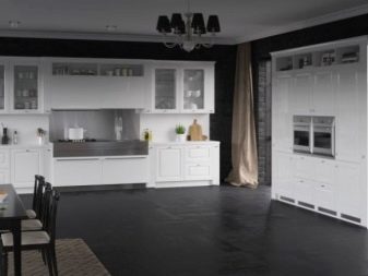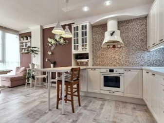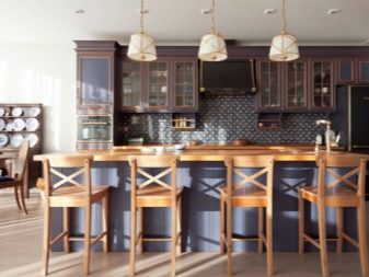 A la cuina elegant, feta en un estil modern, les parets es poden acabar amb materials blancs, i al terra hi ha una gran rajola amb una impressió de pedra a penes perceptible. En aquest context, quedarà excel·lent un conjunt brillant que combina colors morat i blanc.S’ha de seleccionar una caixa de llapis per a una combinació harmònica en tons morats, amb electrodomèstics integrats.