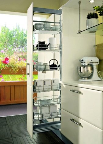 - Emmagatzematge de llaunes plenes d’espècies, productes a granel: generalment es col·loquen a les prestatgeries superiors de l’armari i els contenidors amb conservació es posen fàcilment als compartiments que hi ha a sota.