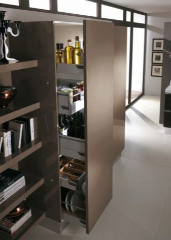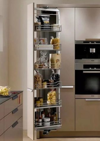 Una caixa de llapis estàndard és un disseny de mobles estret realitzat en forma d'una columna alta. El model es pot executar com a mòdul separat o formar part d’un conjunt de cuina. Malgrat els paràmetres inusuals i la col·locació compacta a la cuina, l’objectiu de l’armari és extens. Pot servir com a lloc convenient per emmagatzemar, a més d’element de disseny a l’interior.