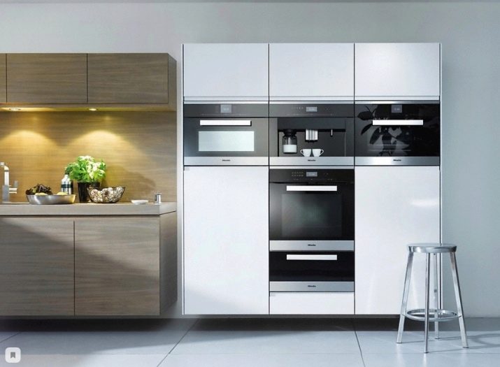 Els estoigs que inclouen els electrodomèstics integrats no són menys exigents avui dia. Podeu instal·lar en un mòdul d’alçada suficient un forn, un microones, un processador d’aliments i altres elements similars. El resultat és un lloc de treball convenient on hi haurà tot el que necessiteu. A la cuina moderna, la nevera també es pot amagar efectivament darrere de la part alta del model alt de la caixa del llapis.