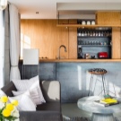 - Un petit sofà darrere de la barra és una gran solució. La cuina es divideix en zones on tot sembla harmoniós, i també hi ha l’oportunitat de passar una bona estona i descansar bé.