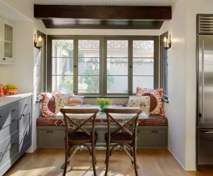 - Sofà llit. Una opció fantàstica tant per a una cuina àmplia com per una petita habitació. A la tarda és un lloc acollidor on poder allotjar els amfitrions i els convidats durant les festes. A la nit, el sofà es pot desfer, cosa que converteix un meravellós lloc per a dues persones. El disseny del sofà també és fàcil d’escollir exactament el que s’ajusta amb èxit a una determinada cuina.
