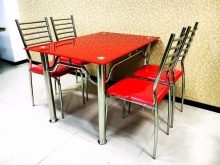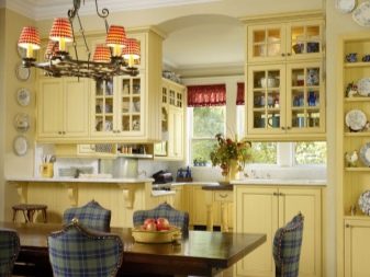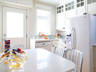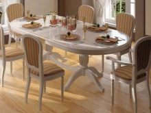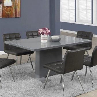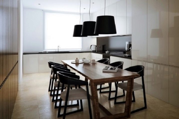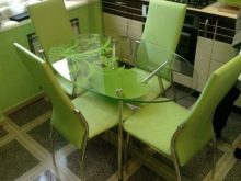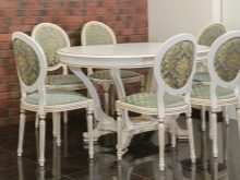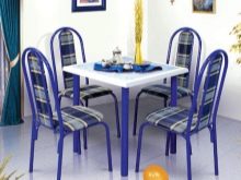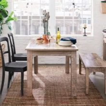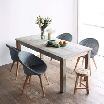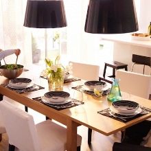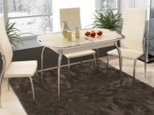 Les taules i les cadires de menjador es poden comprar com a plató o es poden comprar per separat. En aquesta darrera versió, no hi ha res reprovable, el més important és triar els elements del grup de cuina el més harmònicament possible. A més, les opcions de disseny modern impliquen l’ús d’una taula i cadires que no siguin del kit, donen suport a la idea de combinar diversos materials. El conjunt llest per sopar segueix sent un clàssic.