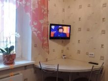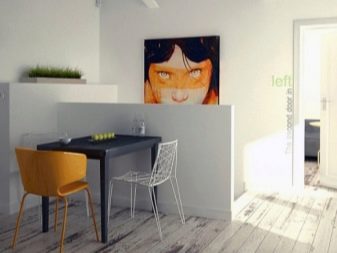 Per a una cuina petita, podeu triar l’opció d’un taulell de bar, de manera que la paret al llarg de la qual s’ubiqui la taula no sembli avorrida, pengeu-hi imatges. L’avantatge d’un disseny així és l’ergonomia, la possibilitat d’alliberar una zona per la finestra. Tot i això, com ja s'ha dit, molts no se senten còmodes per "descansar" amb els ulls a la paret.