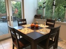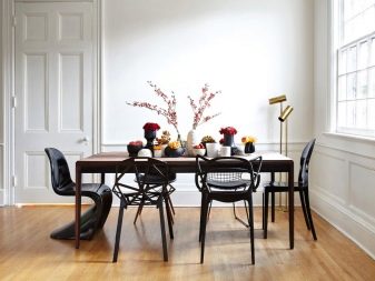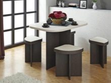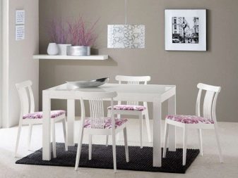 Si una taula i unes cadires petites semblen una mica avorrides, i l’interior en si està fet en un estil modern, d’alta tecnologia o d’alta, aleshores podeu intentar combinar una taula tradicional quadrada amb diferents cadires. Difereixen en mida, color, material de fabricació. Una certa proximitat només es pot trobar en la similitud de les formes de les cadires.