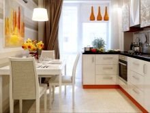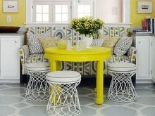 Una versió senzilla, moderna i molt funcional del disseny d’una petita cuina. Aquest grup de menjador no és un conjunt, però sembla harmoniós. La taula i les cadires estan units per una forma abstracta i un material de fabricació. Pel que fa als colors, són una mica diferents: es tracta de 2 colors propers i de diversos colors del mateix color. Fer que el grup de menjador sigui el centre de la composició de la cuina permet la seva ubicació, a més d’il·luminació puntual de la taula amb làmpades penjants, llums.