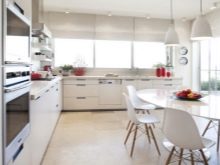 Es poden muntar interiors d’estil d’alta tecnologia i minimalisme mitjançant una taula i cadires transparents de plàstic o metall. Com a opció per a una cuina com aquesta - una taula al llarg de la paret o una barra.