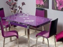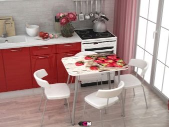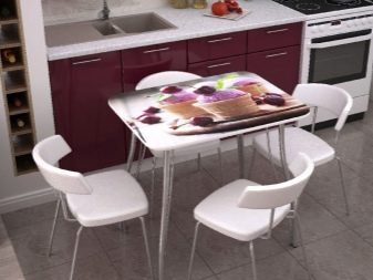 Una opció de disseny de moda és una taula amb impressió fotogràfica, combinada amb el patró d’un davantal de cuina. Una taula de plàstic es pot combinar amb cadires fetes amb el mateix material, planes o de colors. Quan escolliu aquesta última, heu d’assegurar-vos que el color de les cadires recau en la gamma de dibuixos de la taula i del davantal de l’auricular.