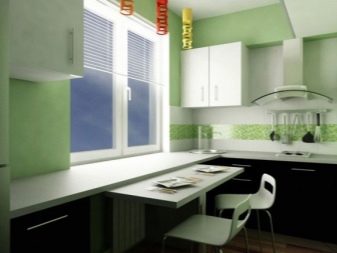 Hi ha 3 opcions principals per a la ubicació de la zona de menjador a la cuina: al llarg de la paret, al centre de l’habitació i per la finestra. Podeu col·locar una taula de qualsevol configuració a prop de la finestra; aquest disseny serà especialment exitós si s'obri una bella vista des de la finestra. Si aquesta part de la paret no és ampla o hi ha una porta del balcó, és molt més racional situar l’extrem de la taula a la finestra. L’opció de disseny és un ampit de taula, quan l’ampit de la finestra s’allarga i reforça, convertint-lo en un taulell.