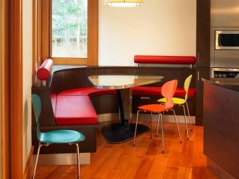 Per a les cuines petites, la més funcional es considera la disposició angular de la taula.Si voleu aportar un ambient acollidor a la sala, trieu els models de taula rodona amb un sofà petit.
