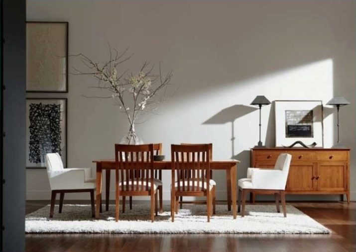 Interior del menjador clàssic amb elements moderns i elegants. Les butaques i les cadires de fusta de disseny tradicional estan batudes per butaques de color blanc de neu amb un disseny modern. El color blanc està “recolzat” per la tapisseria de les cadires, la catifa. Un rar cofre fa que la sala sigui encara més elegant i eclèctica.
