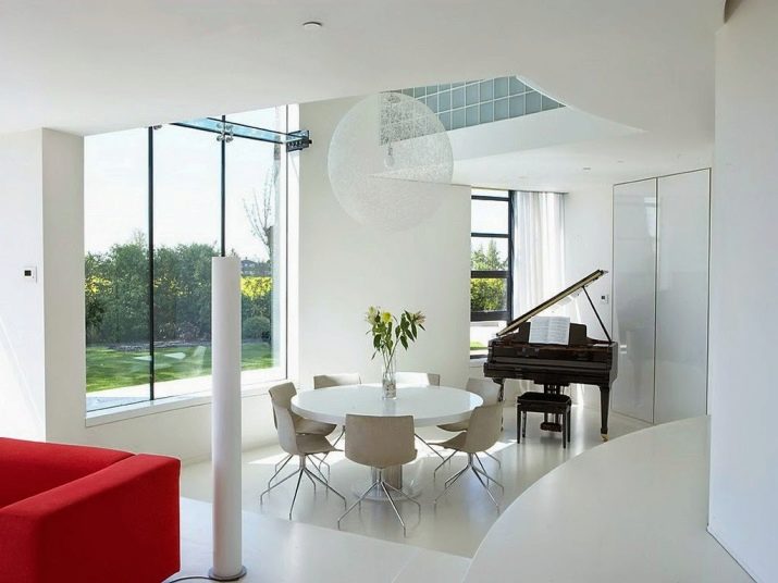 L’elegant disseny del saló-menjador es complementa millor amb una taula rodona de color blanc de neu. Les cadires d'una tonalitat gris clar ajuden a evitar la monotonia i l'ambient hospitalari.