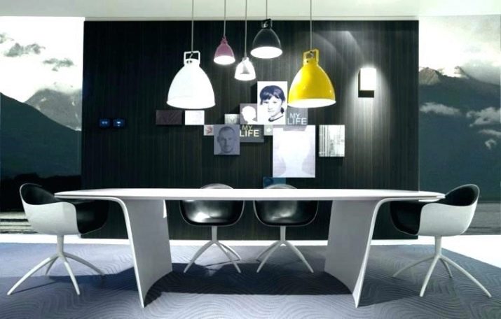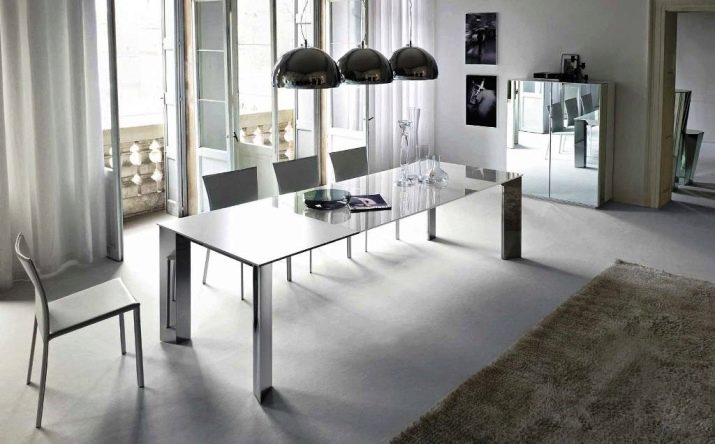 Interior refinat, respectable, però alhora relaxat amb una taula rectangular de vidre. Es combina amb cadires, butaques, algunes de les quals estan recobertes de matèria grisa i altres - amb cuir negre. Accent permet la catifa sota la taula i una làmpada d’aspecte futurista sobre el cordó situat al damunt del grup de menjador.