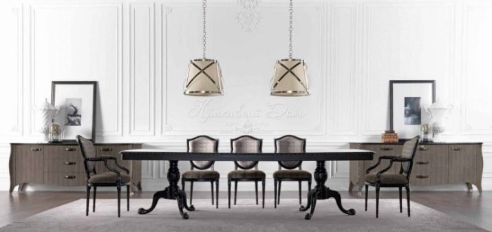 Menjador per menjar en un estil clàssic. Elements distintius: fusta natural, formes lacòniques, molts elements decoratius en cadires, cames de taula. L’interior es complementa amb una catifa de luxe i un candelabre.