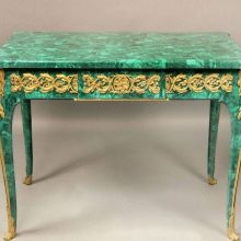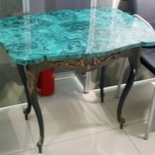- Un complement excel·lent al seu disseny de cuina productes de malacita. Per descomptat, el plaer és car, però un element com un moble farà que el vostre espai de cuina sigui únic. Aquestes taules estan fetes a mida, de qualsevol forma, poden ser sòlides i lliscants. El color maragda únic, les venes i una especial aura de pedra destaquen el seu gust exquisit.