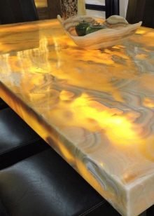 Aquest material permetrà que la superfície de la taula quedi iridescent. Color: segons el vostre gust, des de tons càlids i clars fins a xocolata o marró fosc. Es tracta d’un material resistent, absolutament ecològic, adequat no només per a taulells, sinó també per al taulell de barres.