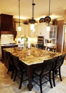 El millor és posar-lo a una cuina gran taula oval - aquesta seria la solució perfecta. Fins i tot es pot trobar al centre de l'habitació. Però a les cuines més petites, intenteu col·locar una taula semi-oval, però no a prop de la paret. Alguns prefereixen una forma de taula inusual - polifacètic.