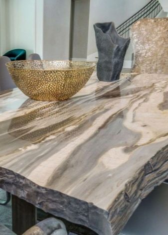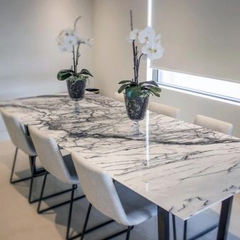 Tot i l’elevat cost d’aquest elegant element de disseny, pot convertir-se en el centre de l’apartament, on s’aplegaran més d’una generació de la família. A més, gairebé totes les taules fetes de pedra natural són instàncies úniques, ja que la pedra en si és única en els seus patrons, impregnacions, venes i transicions de colors.