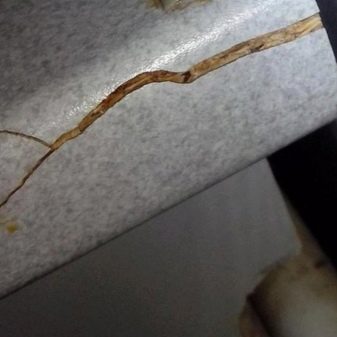 Pel que fa a les mancances, doncs en cas que el fabricant negligent hagi guardat a la capa de la capa aplicada, pot aparèixer esquerdes al producte. De vegades, per estalviar components, els fabricants afegeixen substàncies nocives, de manera que és millor comprar una taula en botigues de confiança que només hagin demostrat la seva pena. De vegades, les noves taules poden "exhalar" una olor desagradable, però desapareixerà en un futur proper.