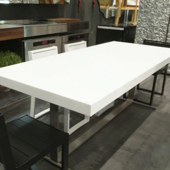 Quan compreu una taula, assegureu-vos de mirar l’anotació, on s’han d’indicar els farcits a base de minerals i resines acríliques. Només llavors podeu estar segur que l'element dels mobles està fabricat amb qualitat i dignitat. Les superfícies acríliques són fàcils de rentar, són resistents i duradores i, si danyes la superfície, es poden polir fàcilment. L’únic requisit és que en cap cas s’han de col·locar plats calents a la superfície de la taula. A més, no trieu detergents ni agressius massa agressius per a superfícies acríliques.