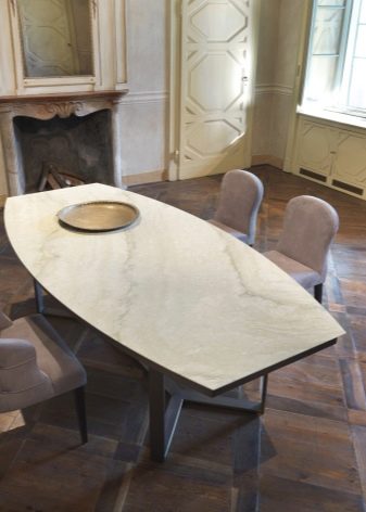Els fabricants poden oferir-vos qualsevol forma de taula feta amb pedra natural, el material es gira fàcilment i pren forma de forma oval, rectangle, quadrat o cercle. En alguns casos, podeu comprar "transformadors", el disseny del qual inclou taulells addicionals connectats amb pins metàl·lics.