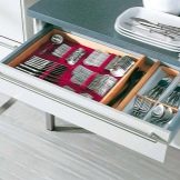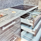 Una taula amb calaixos no és res més que mobles de tipus modular que, segons el disseny, difereix pel disseny i la capacitat dels estris de cuina. Essencialment Es tracta d’una taula amb un organitzador integrat o un sistema d’emmagatzematge per a diversos accessorisincloses cassoles, olles, altres estris, gerres de cereals, ampolles d’oli i espècies. Depenent de la varietat del model pot formar part de la cuina o ser elements independents dels mobles.