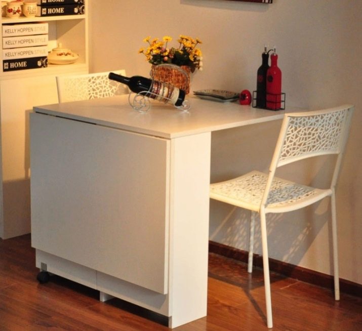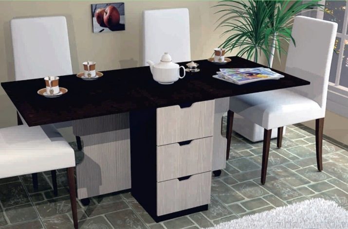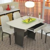 Si la cuina és petita, podeu mirar el model del transformador. Aquesta taula és capaç d’acollir dos usuaris i, si és necessari, més, per a això només cal estendre la taula. Una alternativa a aquesta pot ser una opció de llibre en forma de disseny amb una unitat central i un calaix.