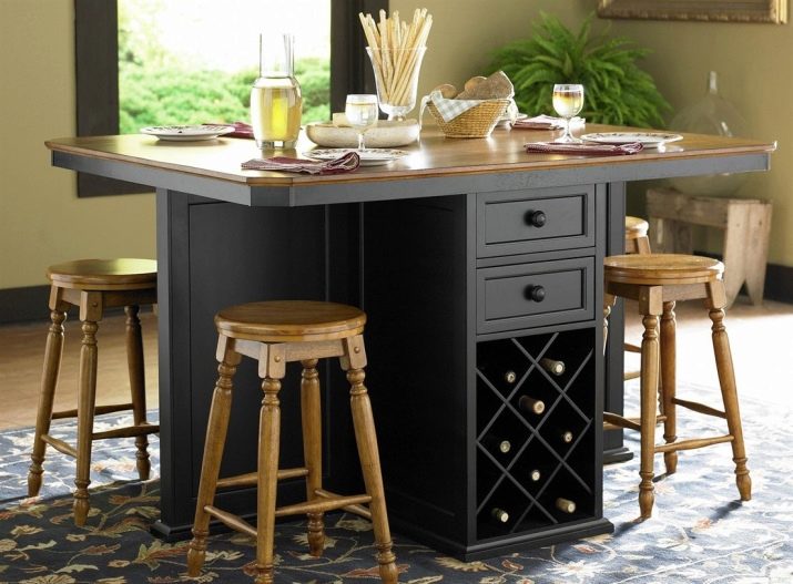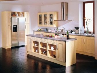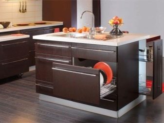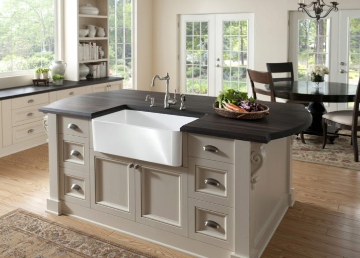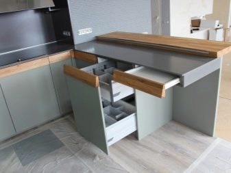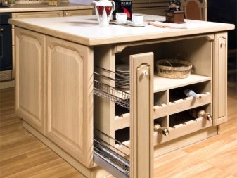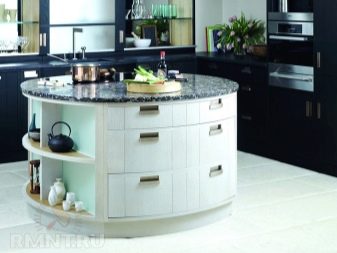La taula de la cuina amb calaixos en forma de pedreria té dues portes, sovint un lavabo i un taulell de treball. Trieu-la com a illa de l'auricular principal, situant-la a una distància convenient per cuinar. Aquest model és voluminós, al igual que el conjunt, es compra en grans cuines, equipant una àrea de treball completa. Aquesta és una opció fantàstica per a cuines ubicades en estudis.