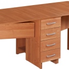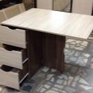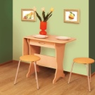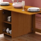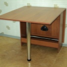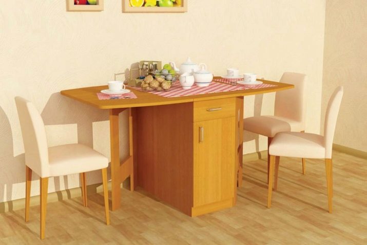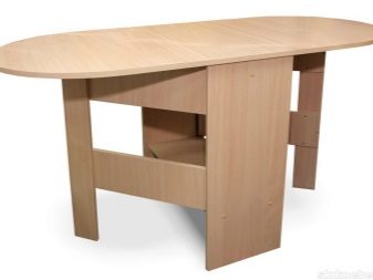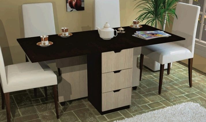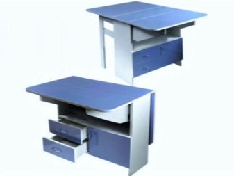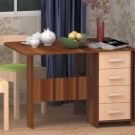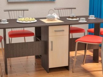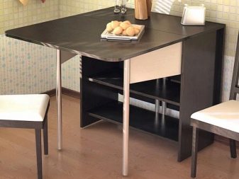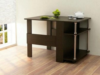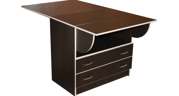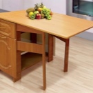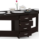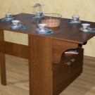 La taula té un propòsit diferent. Es pot utilitzar en forma d’escriptori, per al qual n’hi ha prou amb simplement estendre una de les seves ales. Aquesta opció és ideal per a cuines a Khrushchev.Val la pena donar preferència als models que contenen diversos prestatges i calaixos. Així, serà possible utilitzar-les per guardar diverses coses petites.
