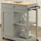 La taula es caracteritza per tenir una amplitud àmplia per la presència de prestatges i calaixos. La pedra de ronda blanca de neu amb un taulell de treball de fusta sembla bonica i suau. Aquesta taula es pot utilitzar principalment per tallar i cuinar, tot i que també és adequada per a dinar per a dos.