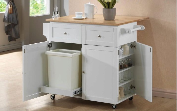 Aquesta opció serà indispensable per a les cuines petites. Gràcies a l’ús d’un mecanisme senzill, que també s’utilitza per a una taula plegable, aquesta tauleta de nit es pot utilitzar com a pràctica tauleta sota l’aigüera. Si no necessiteu una taula, aquest element es pot utilitzar com a magatzem per a diversos estris de cuina. En aquest cas, el gabinet de taula té el paper d’un gabinet. Normalment, quan es plega, les seves dimensions són 80x75 cm, però quan es desplega, augmenta aproximadament 2 vegades.