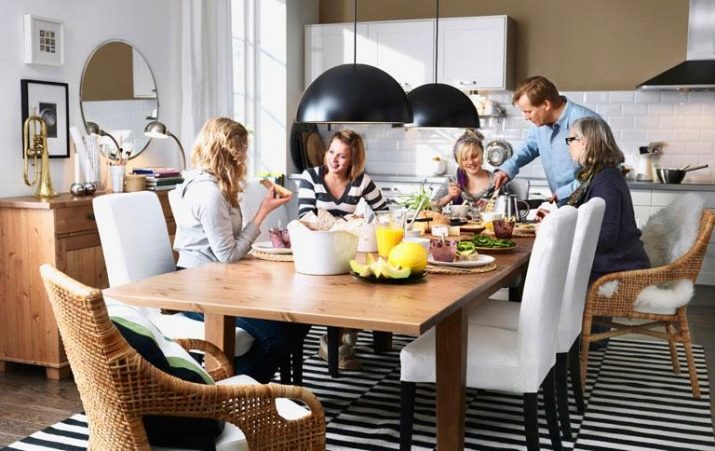 Important: no hi ha cap sentit particular l’elecció de taules de més d’1,05 m. L'ús d'aquestes taules és molt inconvenient, fins i tot a les habitacions més grans. En un entorn tan difícil és comunicar-se i no haureu de confiar en la comoditat. Val la pena pensar en la geometria del producte acabat. Una família de 4-6 persones estarà satisfeta amb mobles rectangulars de 1,5x0,9 m. Si a la casa hi viuen 7 o 8 persones, haurà de triar un model amb unes dimensions de 2x1,1 m.